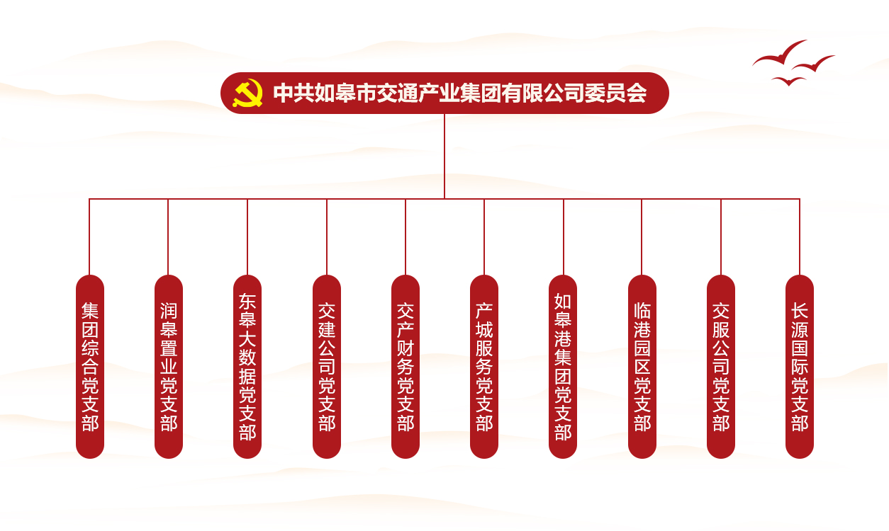 交通產(chǎn)業(yè)集團(tuán)黨委成立于2020年6月。目前黨委下轄10個(gè)黨支部,共有黨員180余名。近年來,在市委市政府的正確領(lǐng)導(dǎo)下,交通產(chǎn)業(yè)集團(tuán)黨委緊扣“一路先鋒”黨建品牌,堅(jiān)持以“黨建引領(lǐng)、組織保障、文化聚力、服務(wù)發(fā)展”為主線,牢牢把握促進(jìn)國(guó)有資產(chǎn)保值增值總體要求,聚力打好高質(zhì)量發(fā)展硬仗,實(shí)現(xiàn)黨建工作與公司發(fā)展同頻共振、互融共促。2021-2022連續(xù)兩年獲評(píng)基層黨建優(yōu)秀“書記項(xiàng)目”,2022年集團(tuán)黨委獲評(píng)如皋市先進(jìn)基層黨組織,2023年獲評(píng)南通市女職工康乃馨服務(wù)站示范典型、南通市工會(huì)“職工書屋”示范點(diǎn)、如皋市黨建研究?jī)?yōu)秀論文二等獎(jiǎng) 。